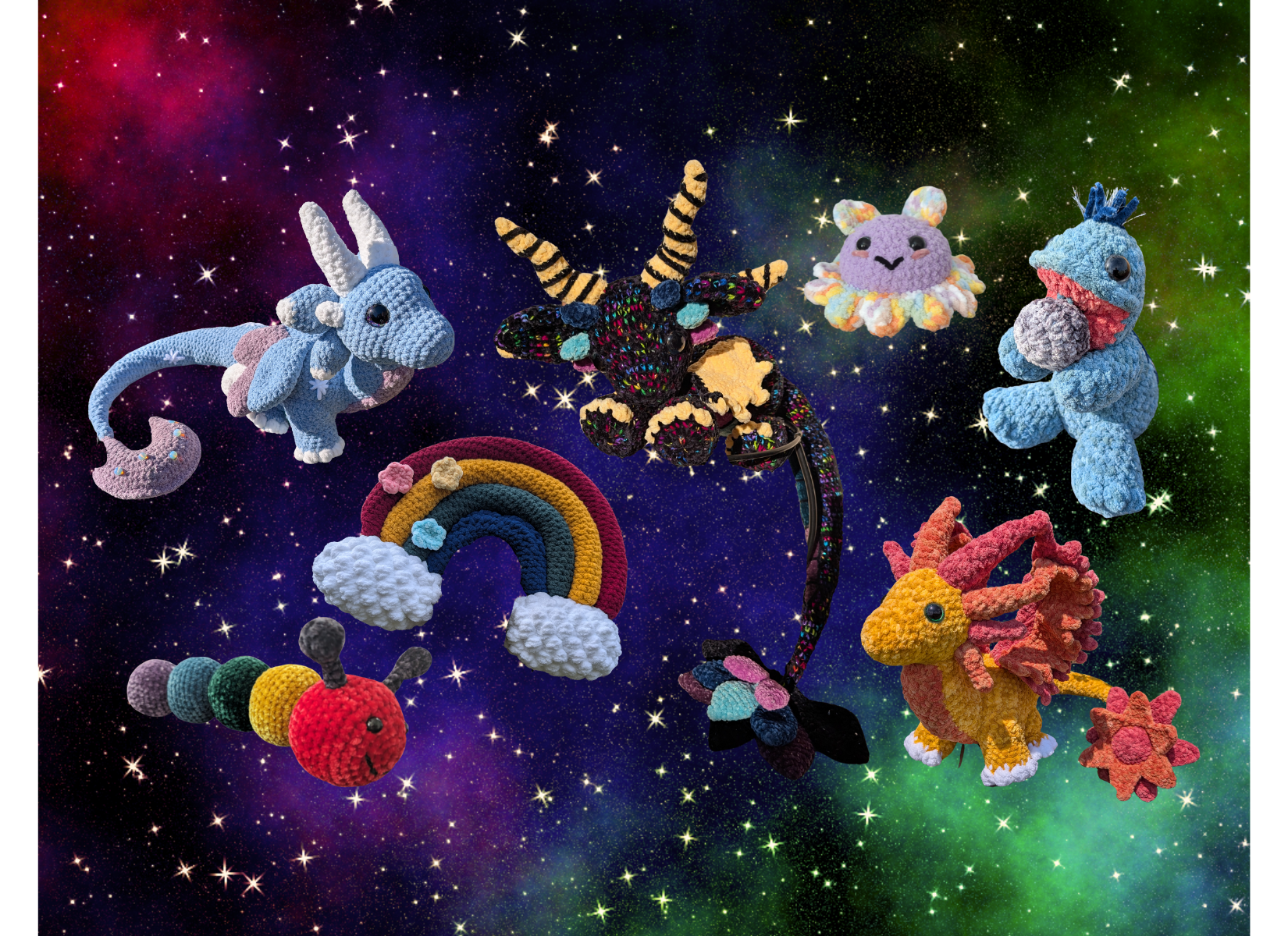 Hand-crocheted plushies, cosmic patterns & cross-stitch magic!